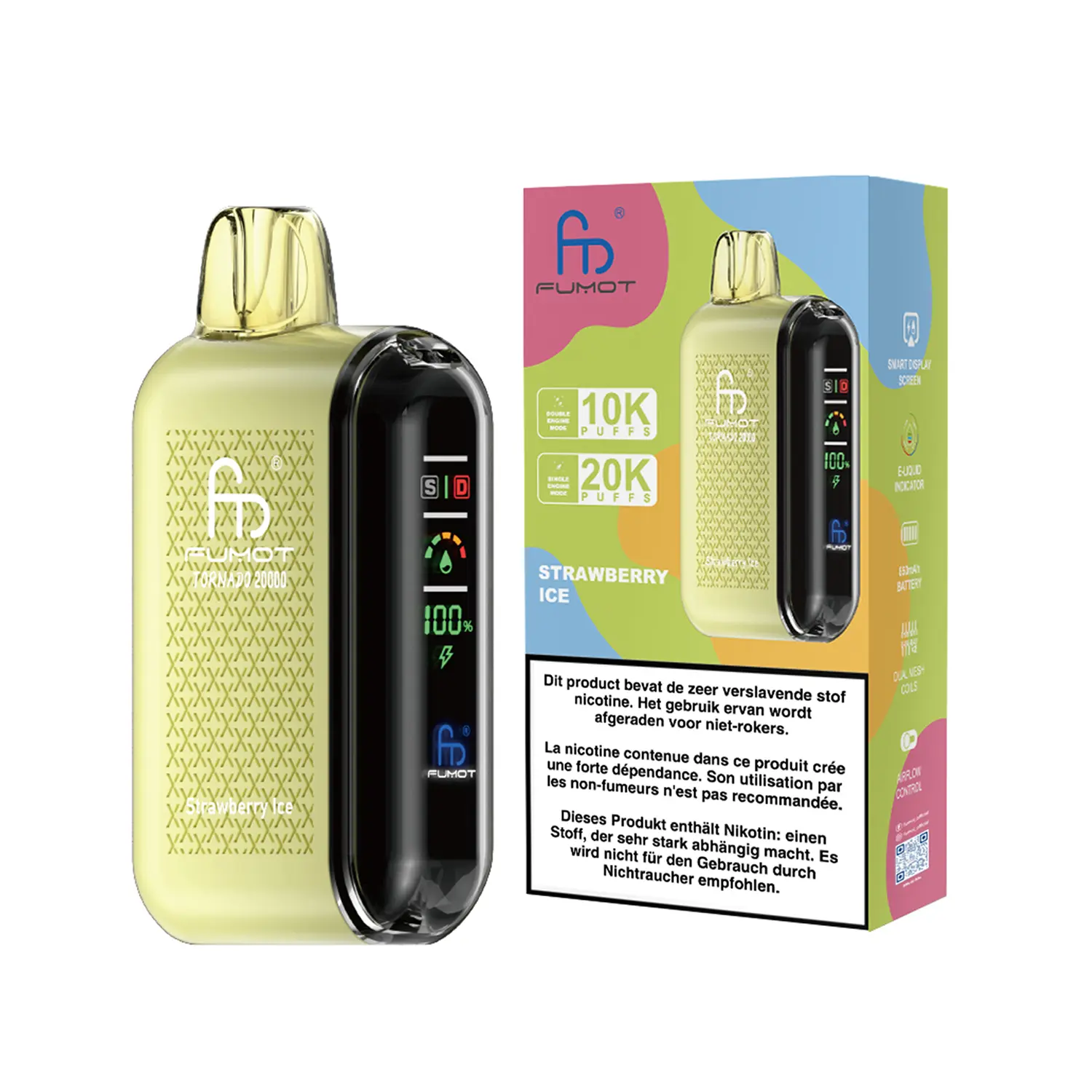 The Lightweight and ergonomic design makes the Fumot Tornado 20000 Strawberry Ice the ideal companion for hot days and active moments. With the adjustable airflow system the ratio between the sweet strawberry flavour and the refreshing menthol kick can be adjusted according to personal preference.