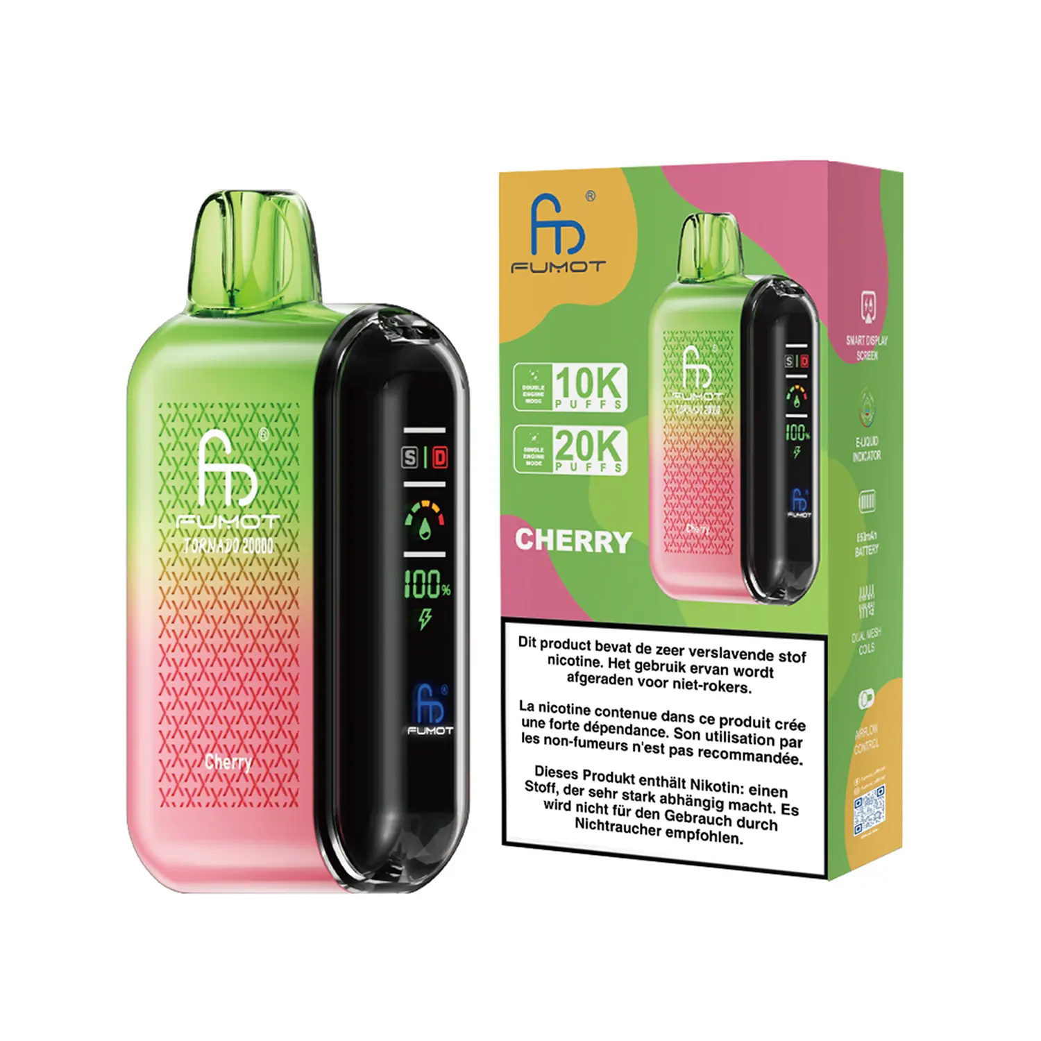 Der Fumot Tornado 20000 Cherry ist ein vollautomatischer Einweg-Vape ohne jegliche Bedienelemente. Einfach auspacken, einen Zug nehmen und den puren, authentischen Kirschgeschmack sofort in vollen Zügen erleben – zeitloser Genuss ohne Komplikationen.